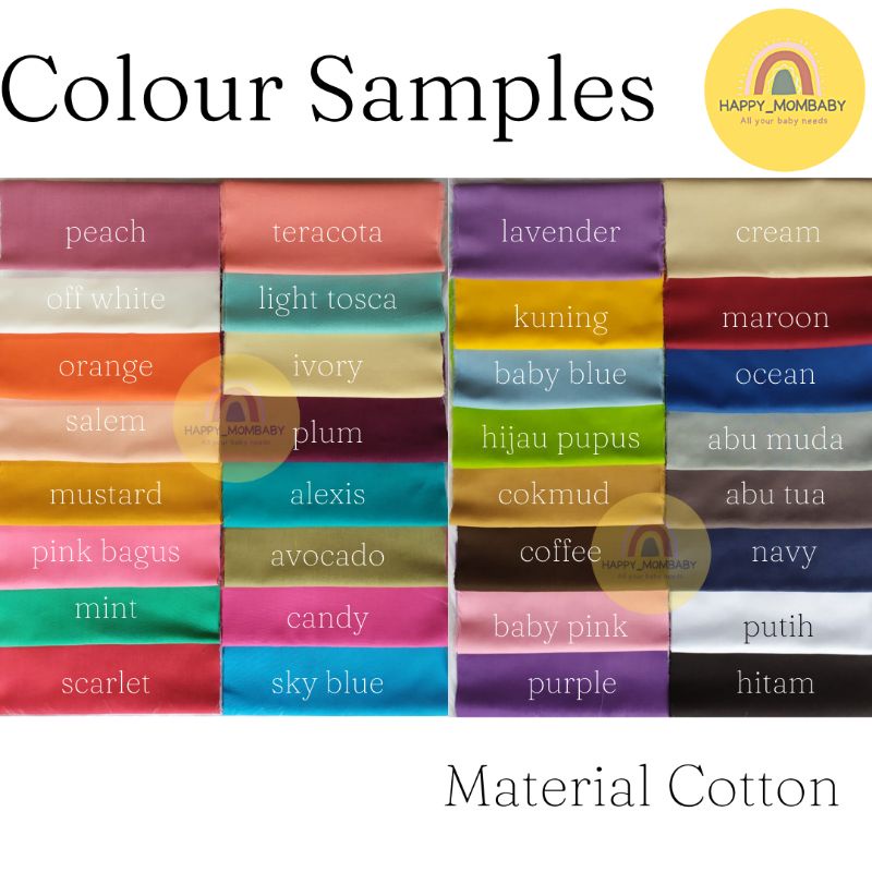 Produk ini memiliki 28 Variasi Warna yaitu : Cream,Lavender,Kuning,Salem,Abu muda,Abu tua,Nevy,Putih,Pink bagus,Tosca,Hitam,Maroon,Mustard,Hijau pupus,Coklat tua,Peach,Pink Candy,Blue sky,Hijau Mint,Olive,Baby blue,Teracota,Orange,Army,Coklat muda,Purple/Ungu,Blue Ocean,Fanta,